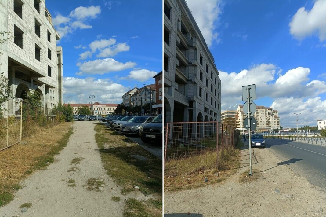 Adesea vezi aici mașini parcate. Și nici nu este ilegal, pentru că trotuarul nu există. Doar un teren viran ce înconjoară clădirea. Poate dacă vine cuiva ideea să facă și aici o pistă de biciclete, se va face și trotuarul. Să sperăm că nu peste alți 20 de ani!