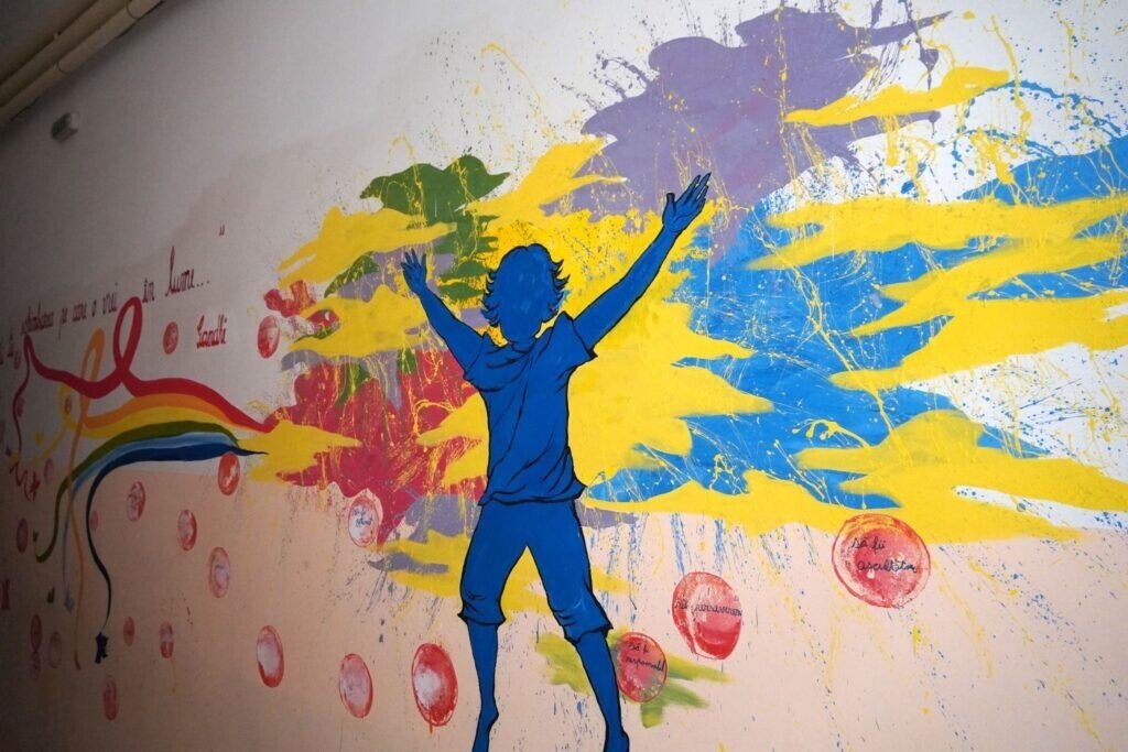 De-a lungul culoarelor de la parter și etaj, alte numeroase picturi deschid copiilor adevărate ferestre spre lume și spre cunoașterea de sine.