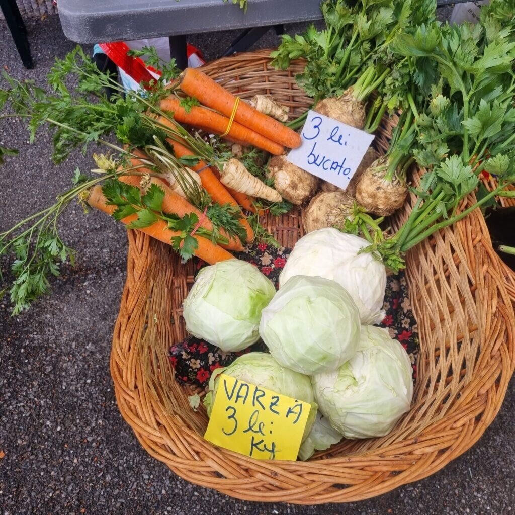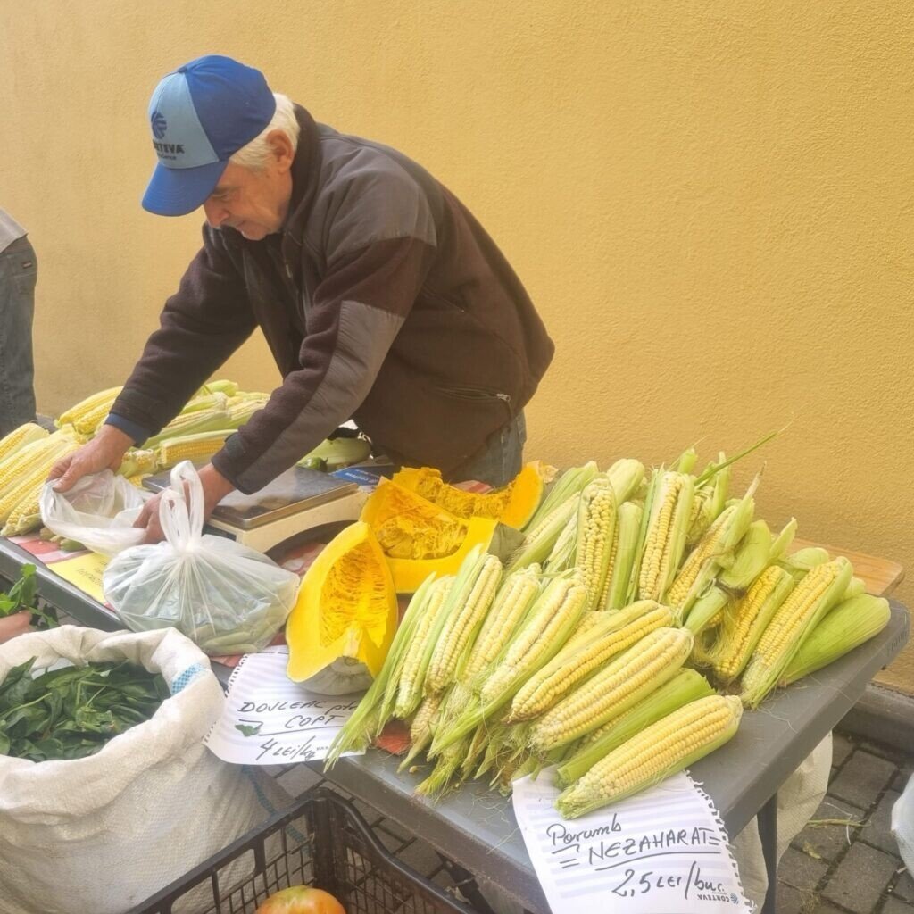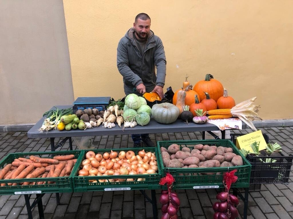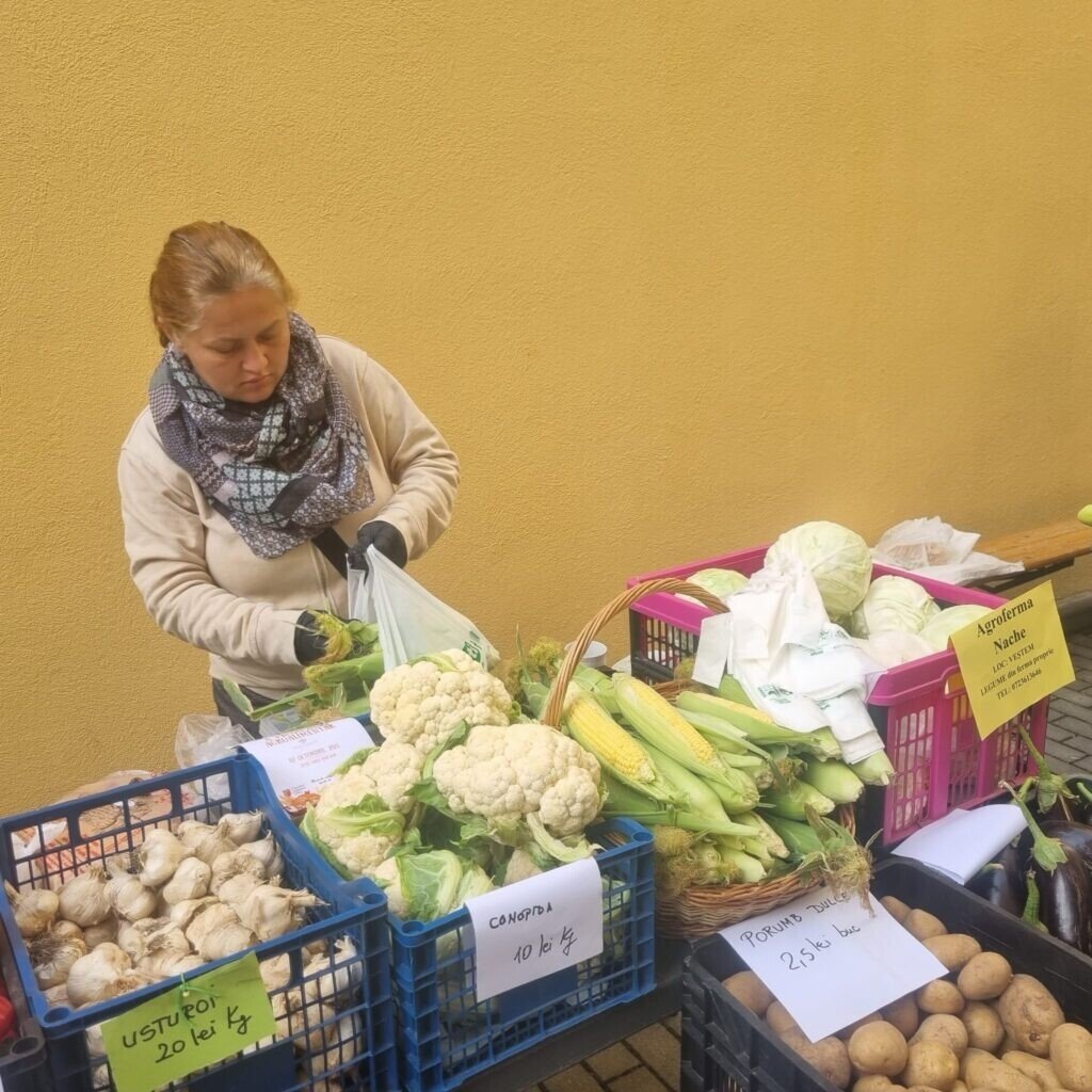 Vinerea aceasta, în 13 octombrie, în plin miez de toamnă, cei 12 producători prezenți la intrarea și în curtea Consiliului Județean Sibiu aduc din gospodăriile lor produse agroalimentare pentru toate gusturile: de la Hamba vin prăjituri de casă, cremșnit și cheesecake, pregătite de Maria Dragotă, de la Apoldu de Jos, Mioara Sită ne aduce pâine de casă, plăcintă cu prune, cornulețe, covrigei și alte produse de patiserie; de la Bazna, Sorin Duma ne îmbie cu porumb pentru fiert, cu spanac și rucola, cu dovleac de copt, feliat, cu mazăre boabe, iar Ion Buică de la Veștem, alături de roșiile sale celebre sau de ardeii iuți, de fasole păstăi și alte legume de sezon, va avea struguri duci și parfumați; vinete, varză, conopidă și ardei culese din Agroferma Nache din Veștem găsim la standul doamnei Mirela Hașegan, unde se poate achita cu cardul bancar; chiar la intrarea în CJ, vă întâmpină familia Dorobanț din Veștem, care ține mult la prezentarea legumelor pe care le aduce în coșuri împletite, de la masa domnului Gheorghe Dorobanț puteți cumpăra varză kale, pe care unele gospodine o pregătesc în cuptor, sub formă de chipsuri foarte apreciate de copii; Maria Fanea din Sibiu e deja recunoscută pentru siropurile, dulcețurile, pentru zacuscă și borcanele cu alte surprize, precum hrean sau sfeclă roșie, pe lângă care găsiți și fasole boabe sau mălai; lapte proaspăt muls, urdă, caș, telemea dulce și sărată, brânză de vaci, brânză frământată, smântână și unt așteaptă să fie degustate și să ajungă pe mesele sibienilor la vitrina de după care mereu vă zâmbește doamna Maria Iuga din Tilișca; cârnații, crenvurștii, mezelurile de casă, pregătite în carmangeria Casa cu Carne din Sibiu a familiei Vad, sunt servite cu amabilitate de Nicoleta Vlad.