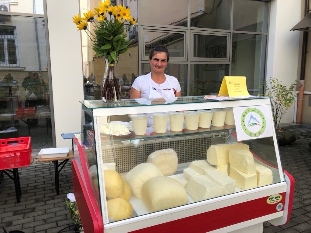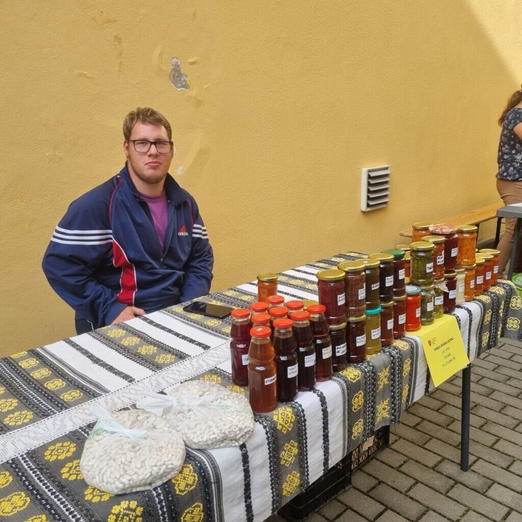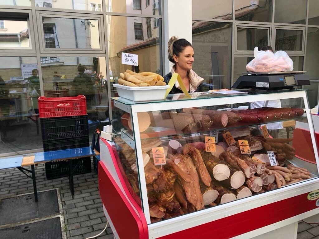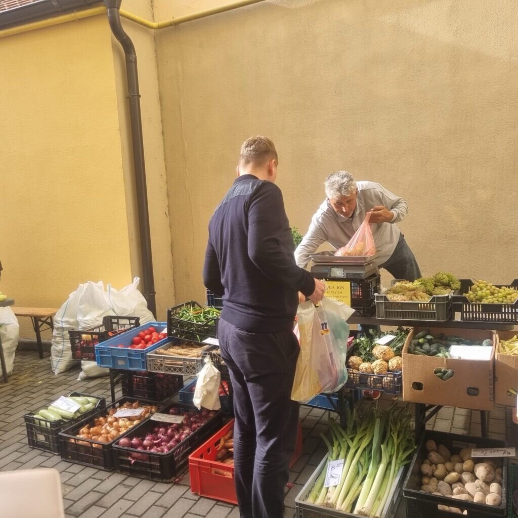 Vinerea aceasta, în 13 octombrie, în plin miez de toamnă, cei 12 producători prezenți la intrarea și în curtea Consiliului Județean Sibiu aduc din gospodăriile lor produse agroalimentare pentru toate gusturile: de la Hamba vin prăjituri de casă, cremșnit și cheesecake, pregătite de Maria Dragotă, de la Apoldu de Jos, Mioara Sită ne aduce pâine de casă, plăcintă cu prune, cornulețe, covrigei și alte produse de patiserie; de la Bazna, Sorin Duma ne îmbie cu porumb pentru fiert, cu spanac și rucola, cu dovleac de copt, feliat, cu mazăre boabe, iar Ion Buică de la Veștem, alături de roșiile sale celebre sau de ardeii iuți, de fasole păstăi și alte legume de sezon, va avea struguri duci și parfumați; vinete, varză, conopidă și ardei culese din Agroferma Nache din Veștem găsim la standul doamnei Mirela Hașegan, unde se poate achita cu cardul bancar; chiar la intrarea în CJ, vă întâmpină familia Dorobanț din Veștem, care ține mult la prezentarea legumelor pe care le aduce în coșuri împletite, de la masa domnului Gheorghe Dorobanț puteți cumpăra varză kale, pe care unele gospodine o pregătesc în cuptor, sub formă de chipsuri foarte apreciate de copii; Maria Fanea din Sibiu e deja recunoscută pentru siropurile, dulcețurile, pentru zacuscă și borcanele cu alte surprize, precum hrean sau sfeclă roșie, pe lângă care găsiți și fasole boabe sau mălai; lapte proaspăt muls, urdă, caș, telemea dulce și sărată, brânză de vaci, brânză frământată, smântână și unt așteaptă să fie degustate și să ajungă pe mesele sibienilor la vitrina de după care mereu vă zâmbește doamna Maria Iuga din Tilișca; cârnații, crenvurștii, mezelurile de casă, pregătite în carmangeria Casa cu Carne din Sibiu a familiei Vad, sunt servite cu amabilitate de Nicoleta Vlad.