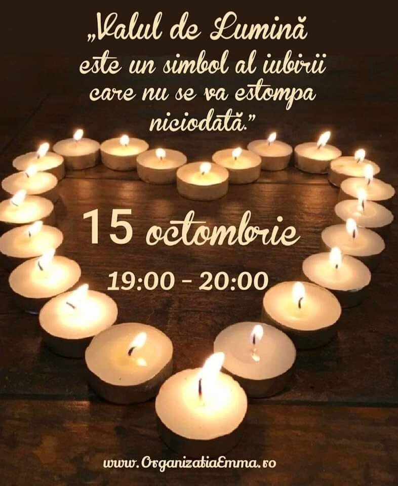 Asociația Emma organizează și în acest an la Sibiu „Valul de lumină”, cu prilejul Zilei Internaționale a comemorării bebelușilor și a copiilorEvenimentul are loc duminică, 15 octombrie de la ora 19:00 la 20:00 în Sibiu, ca și în ultimii ani, pe Bulevardul Victoriei 32 , în curte la Business Cofee 2 Go.