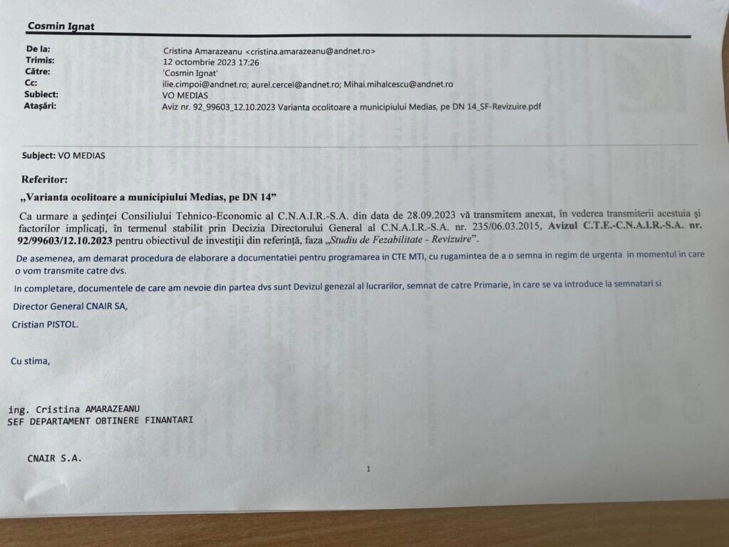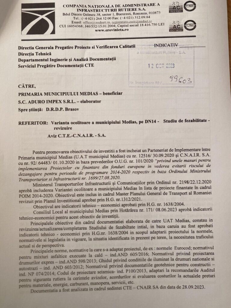 „Am primit astăzi o veste foarte bună pentru orașul nostru și anume, aceea că în cadrul ședinței Consiliului Tehnico-Economic al C.N.A.I.R-S.A. a fost emis avizul pentru Varianta Ocolitoare a municipiului Mediaș, pe DN 14. Este practic o veste pe care noi toți cei care locuim în nordul județului Sibiu o așteptăm de peste 30 de ani. Îmi exprim speranța că, până la finalul acestui an, vom parcurge toate etapele care mai trebuie urmate pentru ca acest proiect să fie scos la licitație publică. Le mulțumesc și pe această cale tuturor celor care se implică pentru realizarea acestui proiect de anvergură.“, a declarat primarul municipiului Mediaș, dl. Gheorghe Roman.