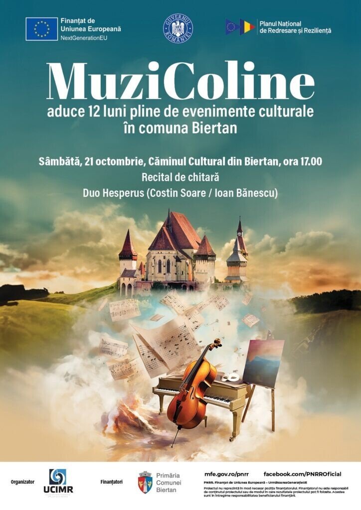 „MuziColine” este un proiect al Asociației „Uniunea de Creație Interpretativă a Muzicienilor din România”, realizat în parteneriat cu Asociația Mioritics și Fundația Gabriela Tudor, cofinanțat de Primăria Comunei Biertan și finanțat de Uniunea Europeană prin Următoarea Generație UE, Planul Național de Redresare și Reziliență, Apel PNRR/2022/C11/I5 – 1. Proiectul nu reprezintă în mod necesar poziția finanțatorului. Finanțatorul nu este responsabil de conținutul proiectului sau de modul în care rezultatele proiectului pot fi folosite. Acestea sunt în întregime responsabilitatea beneficiarului finanțării. Detalii pe website-ul https://mfe.gov.ro/pnrr/ și pagina de Facebook www.facebook.com/PNRROficial/.