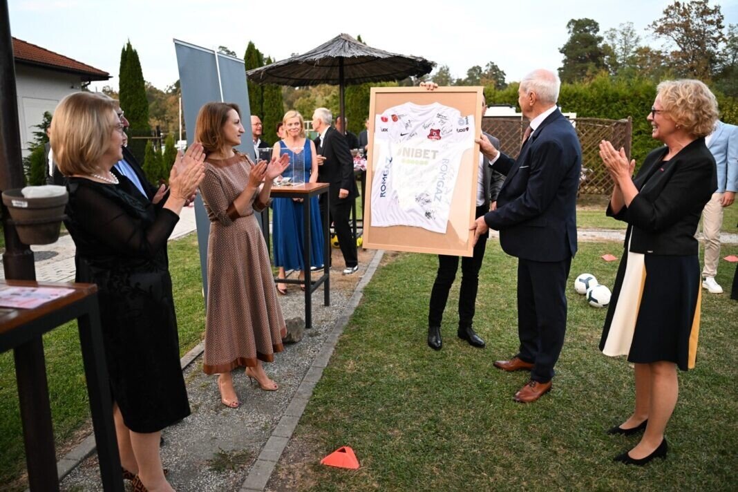 Cu ocazia recepţiei din acest an de Ziua Unităţii Germaniei din data de 04.10., Sibiul şi-a arătat faţa sportivă. Pentru că anul viitor Campionatul European de fotbal masculin va fi organizat în Germania, doamna Consul Kerstin Ursula Jahn în colaborare cu echipa de fotbal locală FC Hermannstadt a organizat o acţiune sportivă dedicată fotbalului. Ca într-un studio de televiziune german, oaspeţii şi-au putut încerca norocul şutând spre una din cele două porţi montate în aer liber. Cine reuşea să marcheze un gol, primea un cadou din partea clubului FC Hermannstadt. Mai cu seamă însă la fiecare încercare de a şuta, competitorii erau rugaţi să facă o donaţie pentru Ospiciul pentru copii Carl Wolff. În condiţii meteo extrem de favorabile, oaspeţii – atât domnii cât şi doamnele – mulţi dintre ei membri cunoscuţi ai comunităţii locale, şi-au încercat plini de voie bună norocul la poartă şi au donat sume considerabile. Consulul Germaniei, doamna Jahn, s-a bucurat mult să înmâneze vineri, 20 octombrie, cei 6.000 Lei strânşi directoarei Ortrun Rhein.