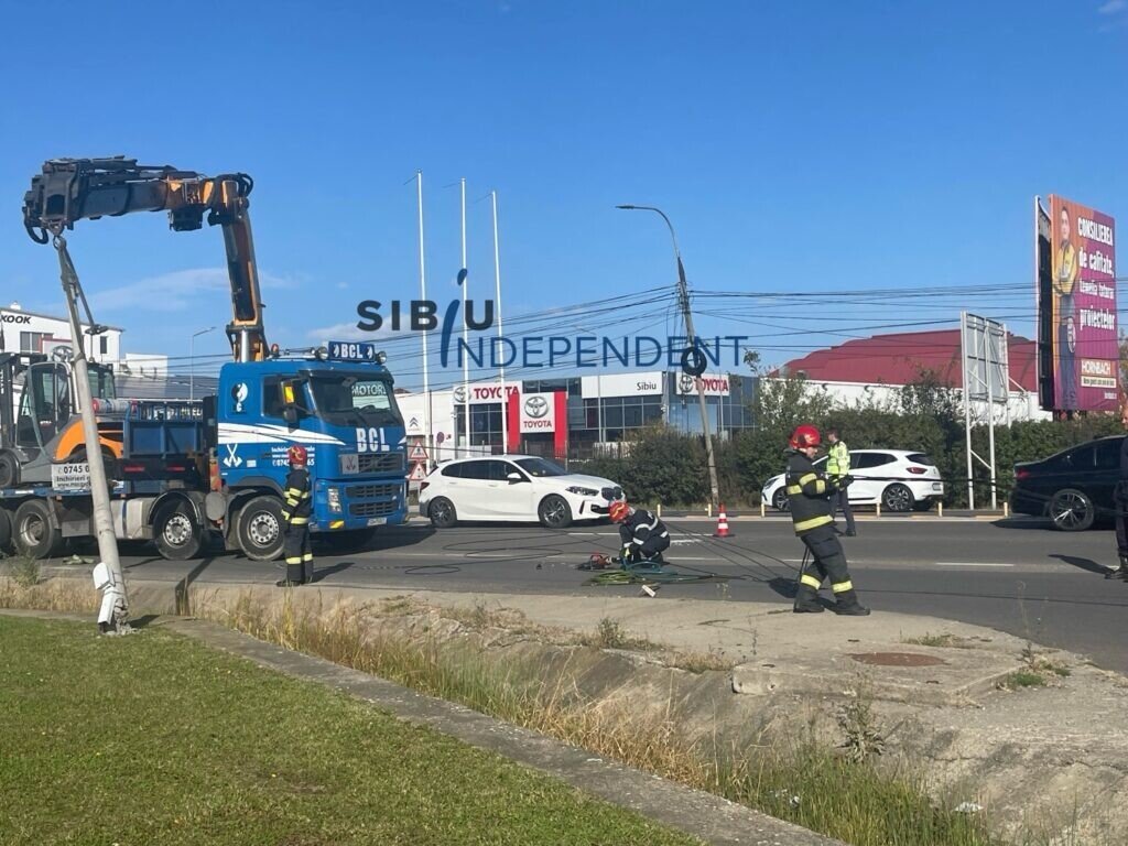 După evaluarea situației, pompierii militari ISU SIBIU au securizat zona, au ancorat stâlpul și cu ajutorul unei macarale au eliberat partea carosabilă.