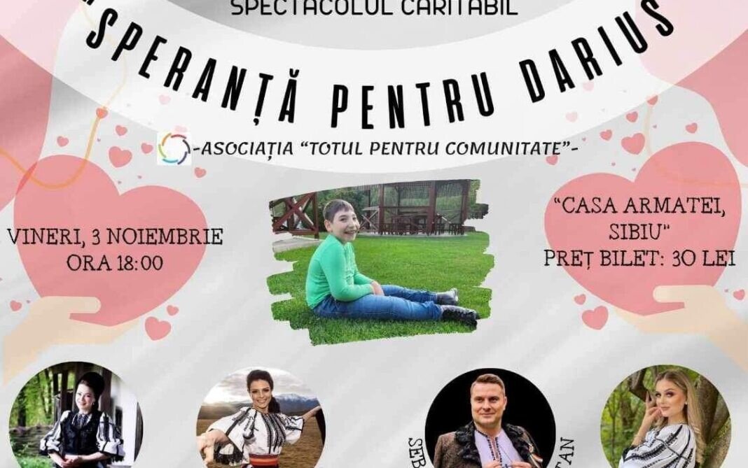 Pentru a ajuta un băiețel de 9 ani anișori, grav bolnav, să fie tratat în străinătate, Asociația „Totul pentru Comunitate” organizează spectacolul caritabil „Speranță pentru Darius”.
