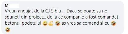 „Vreun anagajat de la CJ (Consiliul Județean) Sibiu… Dacă se poate să ne spuneți din proiect… de la ce companie a fost comandat betonul podețului. Aș vrea să comand și eu!”