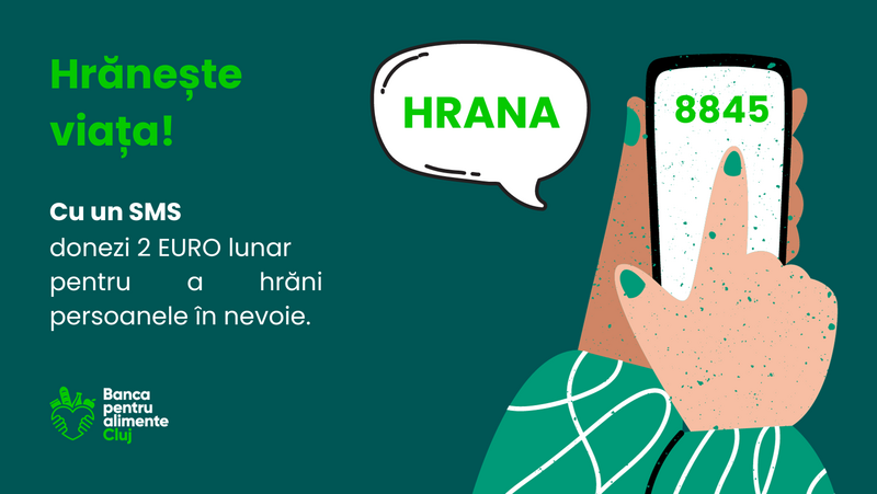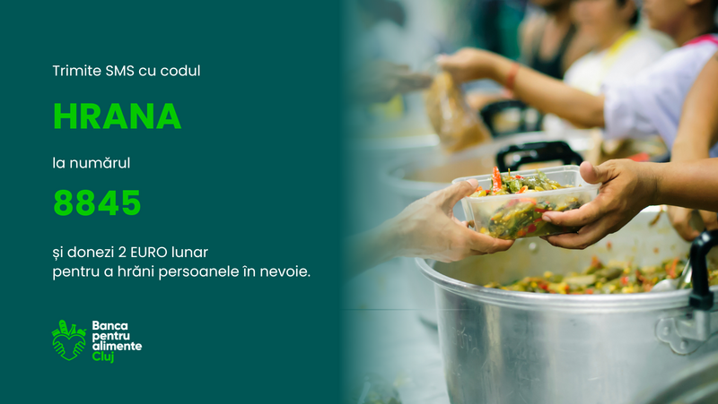 Banca pentru Alimente din Cluj lansează un apel pentru toate persoanele care vor să se implice în reducerea risipei alimentare și a sărăciei din România. Printr-un sms cu textul HRANA trimis la numărul 8845, oricine poate ajuta ca alimente bune de consum să fie salvate de la risipă și să ajungă mai aproape de oameni care au mare nevoie de ele.