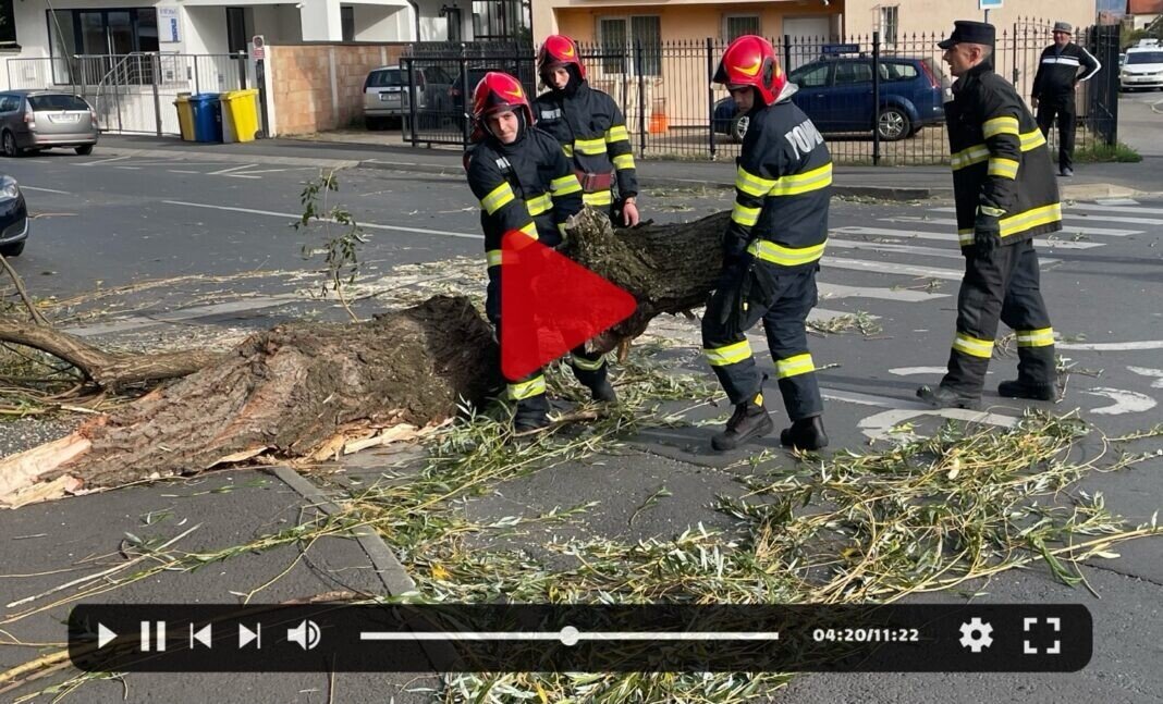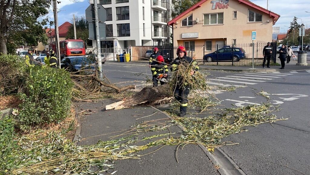 Din cauza vântului puternic, un copac situat la intersecția străzilor Nicolae Iorga și Hipodromului din municipiul Sibiu, a căzut pe carosabil, blocând total circulația rutieră.