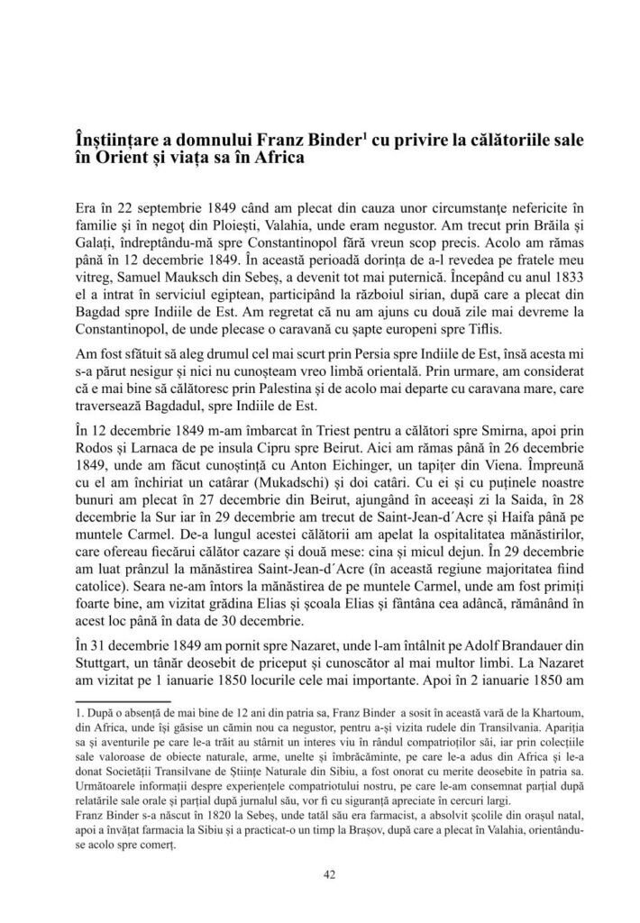 Franz Binder a fost un farmacist sas din Sebeș, Alba. În loc să profeseze a preferat să călătorească și să dezvolte inițiative antreprenoriale în Orientul Mijlociu și în nordul Africii (1849 – 1864), iar la întoarcere a publicat un eseu autobiografic de tip jurnal de călătorie, în limba germană („Mittheilungen des Herrn Franz Binder uber seine Reise in Orient und sein Leben in Africa”, pe care l-a scris pentru publicația Neue Folge din Sibiu, în 1862). Până astăzi, acest material nu a fost niciodată publicat în limbile română sau engleză. De asemenea, nu a fost niciodată realizat până acum un catalog tipărit al colecției.