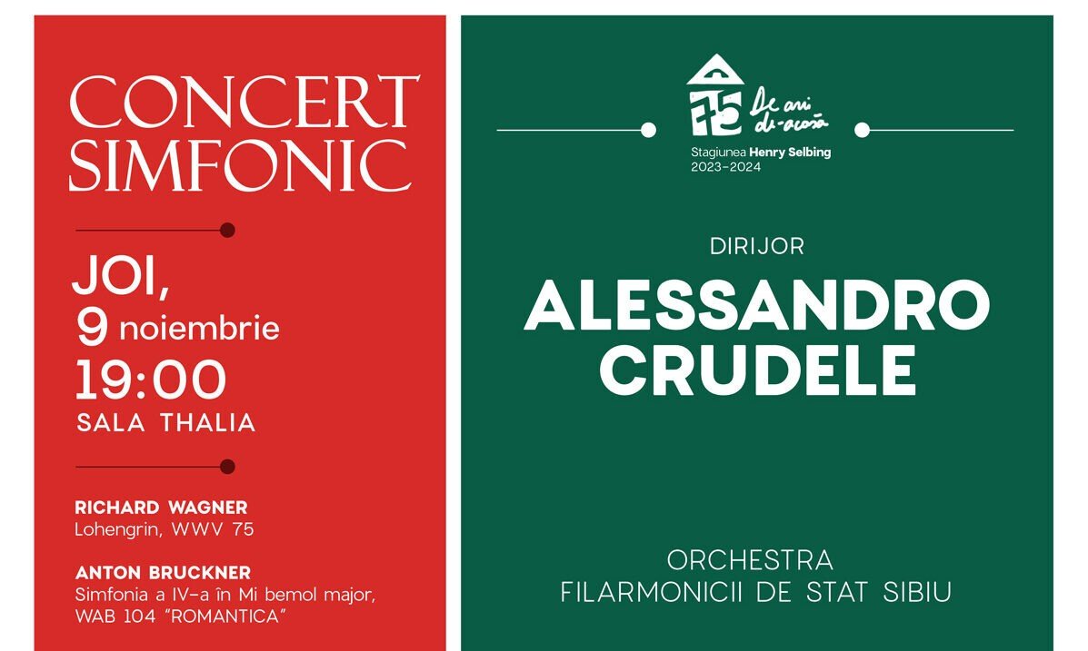 În această săptămână, Filarmonica de Stat Sibiu propune iubitorilor muzicii un concert simfonic dirijat de maestrul Alessandro Crudele, un concert crossover susținut de MH Orchestra alături de soliștii Oana Maria Şerban (soprană) și Florin Butnaru (tenor), un recital de lied (interpretează baritonul Liviu Holender acompaniat de pianista Juliette Journaux) și un atelier creativ de muzică și pictură adresat copiilor cu vârste între 6 și 12 ani.