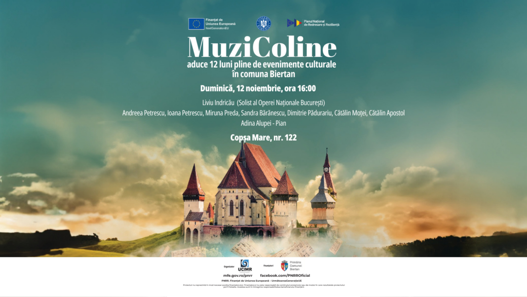 MuziColine este un proiect al Asociației „Uniunea de Creație Interpretativă a Muzicienilor din România”, cofinanțat de Primăria Comunei Biertan și finanțat de Uniunea Europeană prin Următoarea Generație UE, Planul Național de Redresare și Reziliență, Apel PNRR/2022/C11/I5 – 1. Proiectul nu reprezintă în mod necesar poziția finanțatorului. Finanțatorul nu este responsabil de conținutul proiectului sau de modul în care rezultatele proiectului pot fi folosite. Acestea sunt în întregime responsabilitatea beneficiarului finanțării. Detalii pe website-ul https://mfe.gov.ro/pnrr/ și pagina de Facebook www.facebook.com/PNRROficial/.