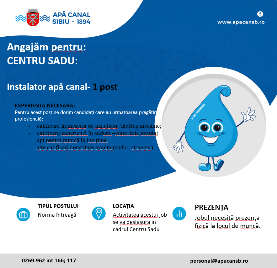 Apă Canal Sibiu S.A. angajează instalator (1 post) pentru Centrul Sadu