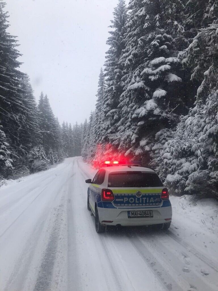 Primii fulgi de zăpadă „au ajuns” deja pe drumul Rășinari – Păltiniș. Polițiștii rutieri sibieni vă recomandă să verificați starea drumurilor și să nu ieșiți nepregătiți la zăpadă, mașina având obligatoriu montate anvelope de iarnă!