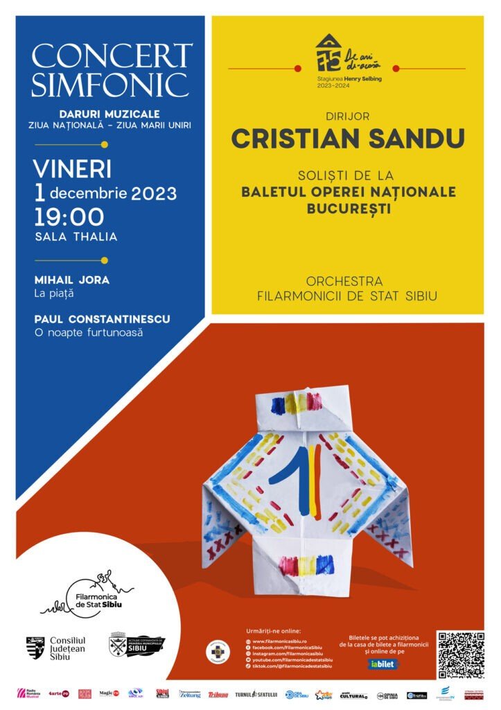 Vineri, 1 Decembrie 2023, ora 19:00 la Sala Thalia din Sibiu va avea loc concertul simfonic de Ziua Națională a României, intitulat Daruri Muzicale.