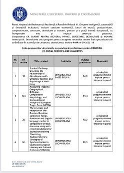 În această a doua etapă a competiției, ULBS a excelat la disciplina Științe sociale și umaniste, unde cele trei proiecte câștigătoare s-au clasat pe locurile 2, 3 și 4, cu 93.4, 93.3 și respectiv 89.3 puncte. Toate cele trei proiecte au fost depuse în domeniul Filologie, cu sprijinul local al cadrelor didactice de la Facultatea de Litere și Arte (Departamentul de Studii Romanice). Cei trei cercetători de renume internațional care vor activa în următoarele 30 de luni în cadrul ULBS în calitate de directori de proiect sunt Franco Moretti, Katarzyna Molek-Kozakowska și Galin Tihanov.