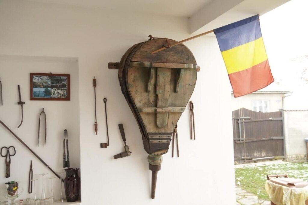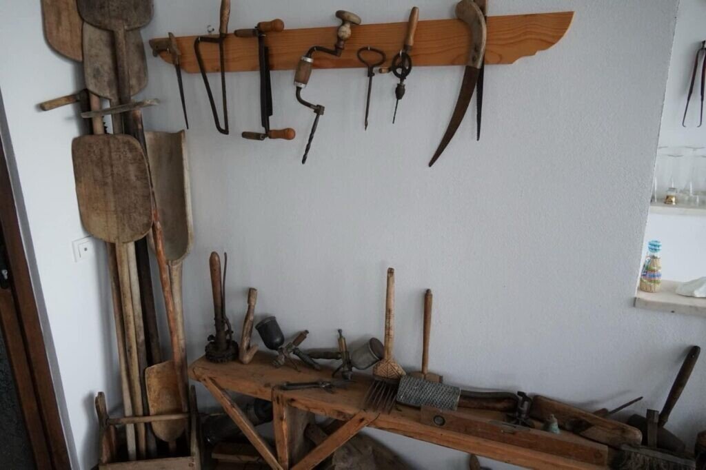 În pridvor sunt expuse o serie de unelte vechi, specifice muncii la câmp, în pădure sau prin atelierele meșteșugărești. „Pe unele le-am strâns din gunoi, pe altele din pivnițe sau poduri”.