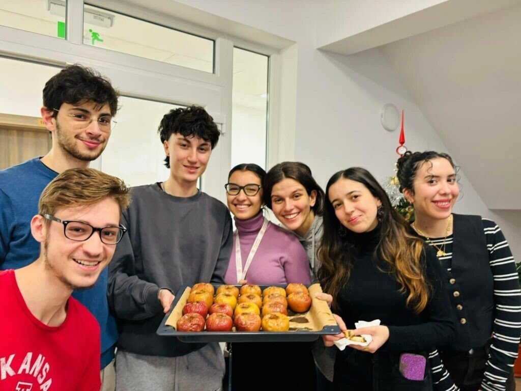 Beatrice, Laura, Deniz, Fernando, Victor și Elena au ales să guste din merele coapte pregătite la cămin și au descris, zâmbind larg, experiența lor la Sibiu ca fiind una foarte “cool”.