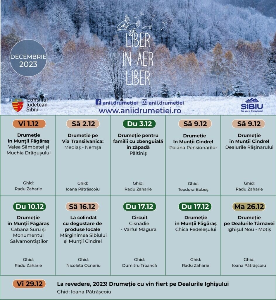 Chiar dacă pe munți este zăpadă, drumețiile prin județ continuă. Asociația Județeană pentru turism alături de Consiliul Județean Sibiu propun noi oferte în cadrul programului Anii Drumeției. Vezi programul mai jos.