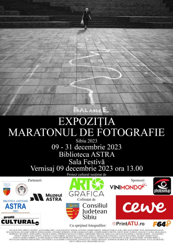 Expoziția „Maratonul de fotografie urbană 2023” din Sala Festivă a Bibliotecii ASTRA se poate vizita până la finalul lunii decembrie 2023. Sunt expuse 60 de fotografii realizate de 47 de fotografi din 8 județe ale țării.