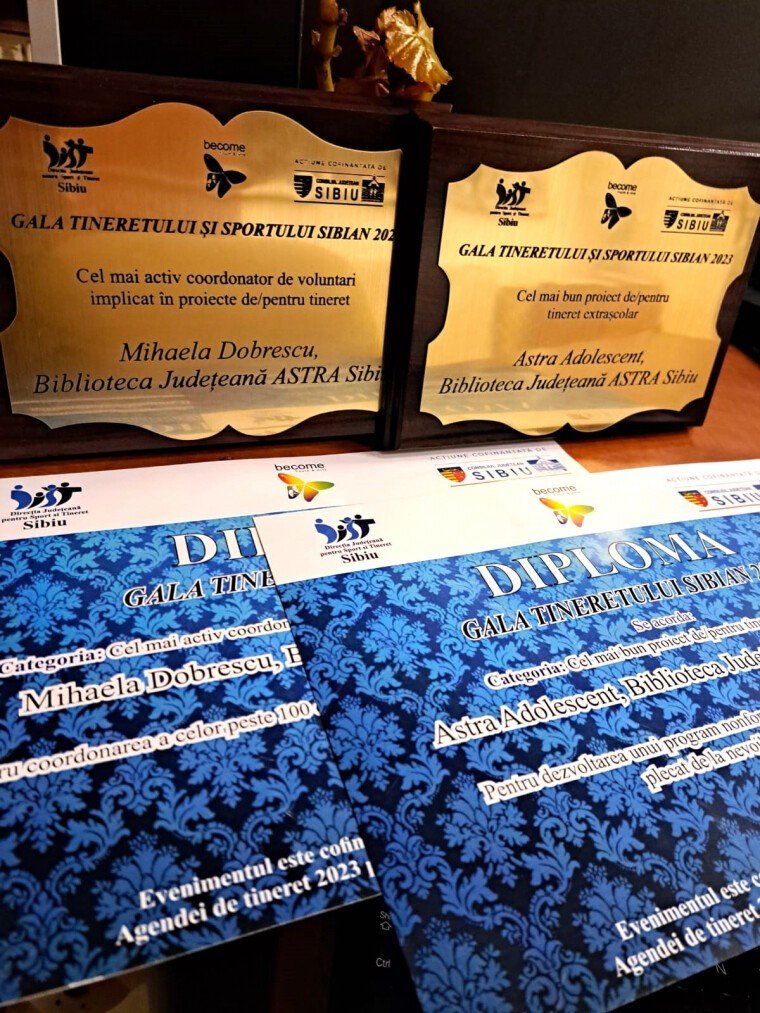 Programul ASTRA Adolescent derulat de Biblioteca #ASTRA Sibiu și coordonatoarea acestuia, d-na Mihaela Dobrescu, au fost premiați în cadrul Galei Tineretului Sibian 2023 la Categoria „Cel mai bun proiect de/ pentru tineret extrașcolar”. La eveniment au participat reprezentanți și voluntari ai bibliotecii publice sibiene. Aceștia au urmărit cu emoție nominalizările și au primit cu bucurie distincțiile acordate.
