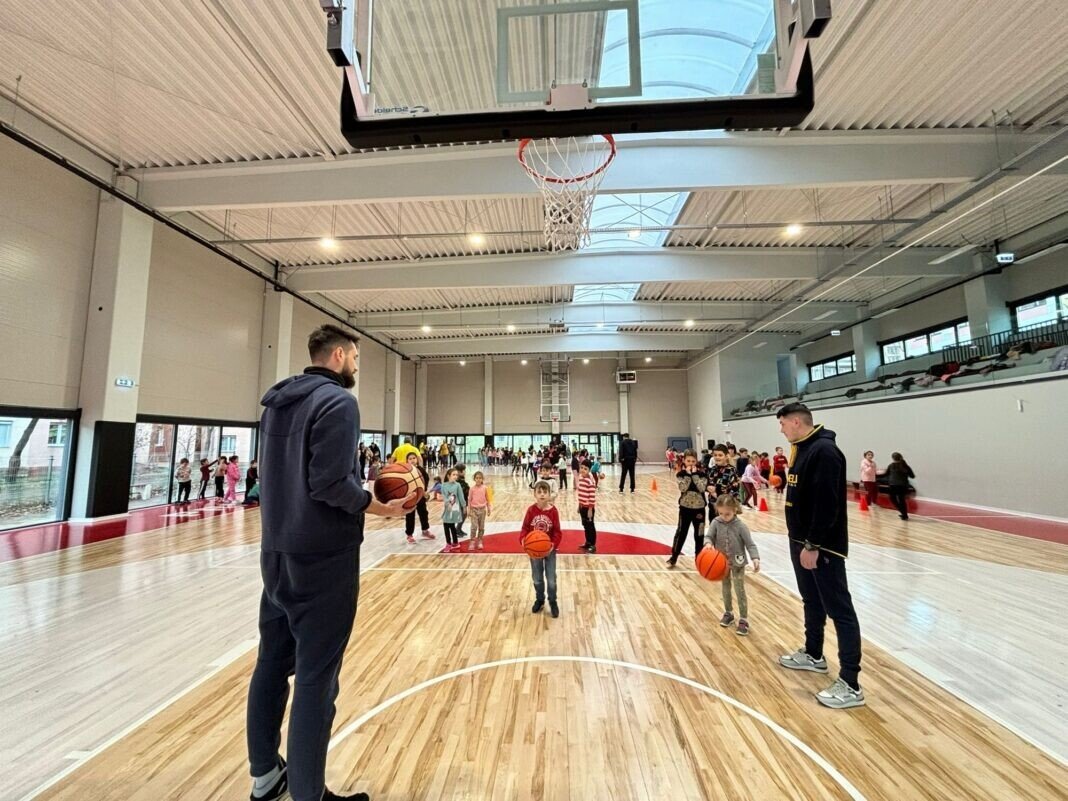 Pe parchetul nou al sălii de sport din cartierul Hipodrom au poposit, miercuri, doi dintre jucătorii echipei de baschet BC CSU Sibiu, fiind primiți în urale de bucurie de cei aproape 300 de copii care, timp de două ore, au fost pregătiți în tainele jocului cu inel.