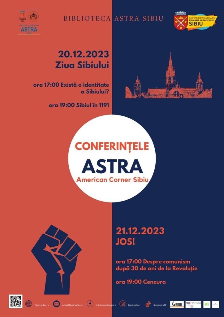 „Ziua Sibiului” și „JOS!” sunt numele pe care le poartă ultimele conferințe, desfășurate în 20 și 21 decembrie 2023, atunci când se va discuta despre istoria Sibiului și căderea comunismului. Discuțiile se vor desfășura la Biblioteca ASTRA, întâlnirile fiind prilejuite de proiectul „Conferințele ASTRA”, cofinanțat de Primăria Municipiului Sibiu și susținut de Consiliul Județean Sibiu.