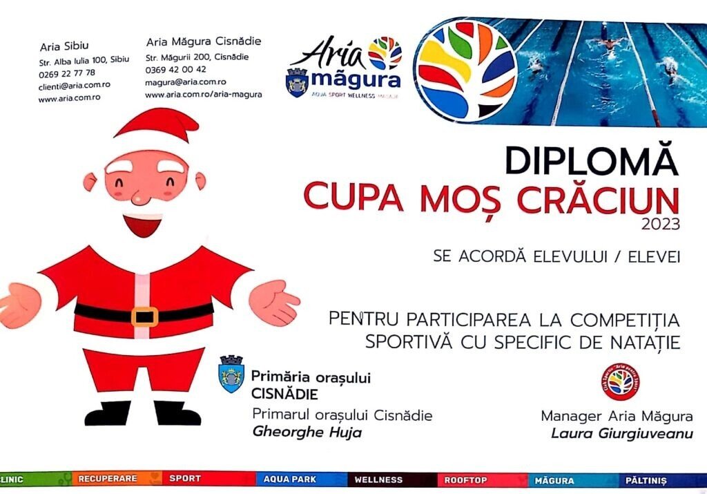 Ieri, 18 decembrie 2023 s-a desfăşurat la bazinul de înot ARIA Măgura din Cisnădie, competiţia sportivă interşcolară, CUPA MOŞ CRĂCIUN la nataţie.