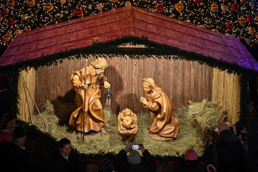 Iesle în mărime naturală, amplasată în Târgul de Crăciun din Sibiu