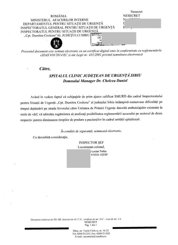 „Precizăm că accesul auto al ambulanțelor în curtea spitalului din sensul giratoriu situat pe strada Herman Oberth, între clădirea Policlinicii SCJU Sibiu și cea a Centrului Stomatologic nu este fezabil, întrucât, în ruta către clădirea UPU, acestea ar trebui să traverseze întreaga curte interioară a spitalului. Întrucât SCJU Sibiu este un spital multipavilionar, acest lucru ar perturba accesul pietonal al pacienților, personalului medical, transferul între secții al pacienților (care în unele cazuri se face cu tărgi sau cărucioare) și ar aduce cu sine o serie de riscuri (blocaje sau chiar accidente). Totodată, ar fi perturbate circuitele spitalicești cum ar fi transportul materialelor sanitare, al sângelui, al deșeurilor etc.