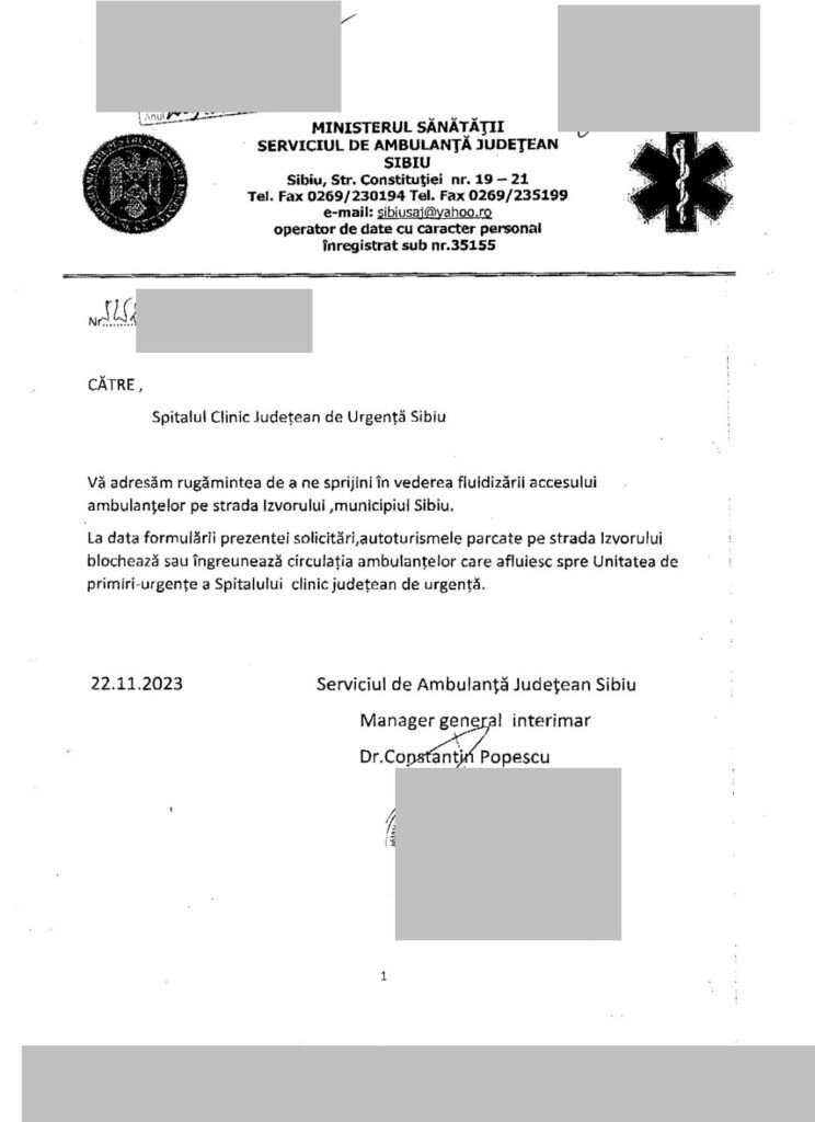 Salavatorii de la ISU și Ambulanță, alături de personalul medical de la UPU Sibiu s-au săturat de situația creată de ani buni de Primăria Sibiu pe strada Izvorului. În goana după un număr mare de parcări, fără investiții, Primăria Sibiu a trasata locuri de parcare și pe partea dreaptă de-a lungul străzii Izvorului și pe stânga, peste pârâu.