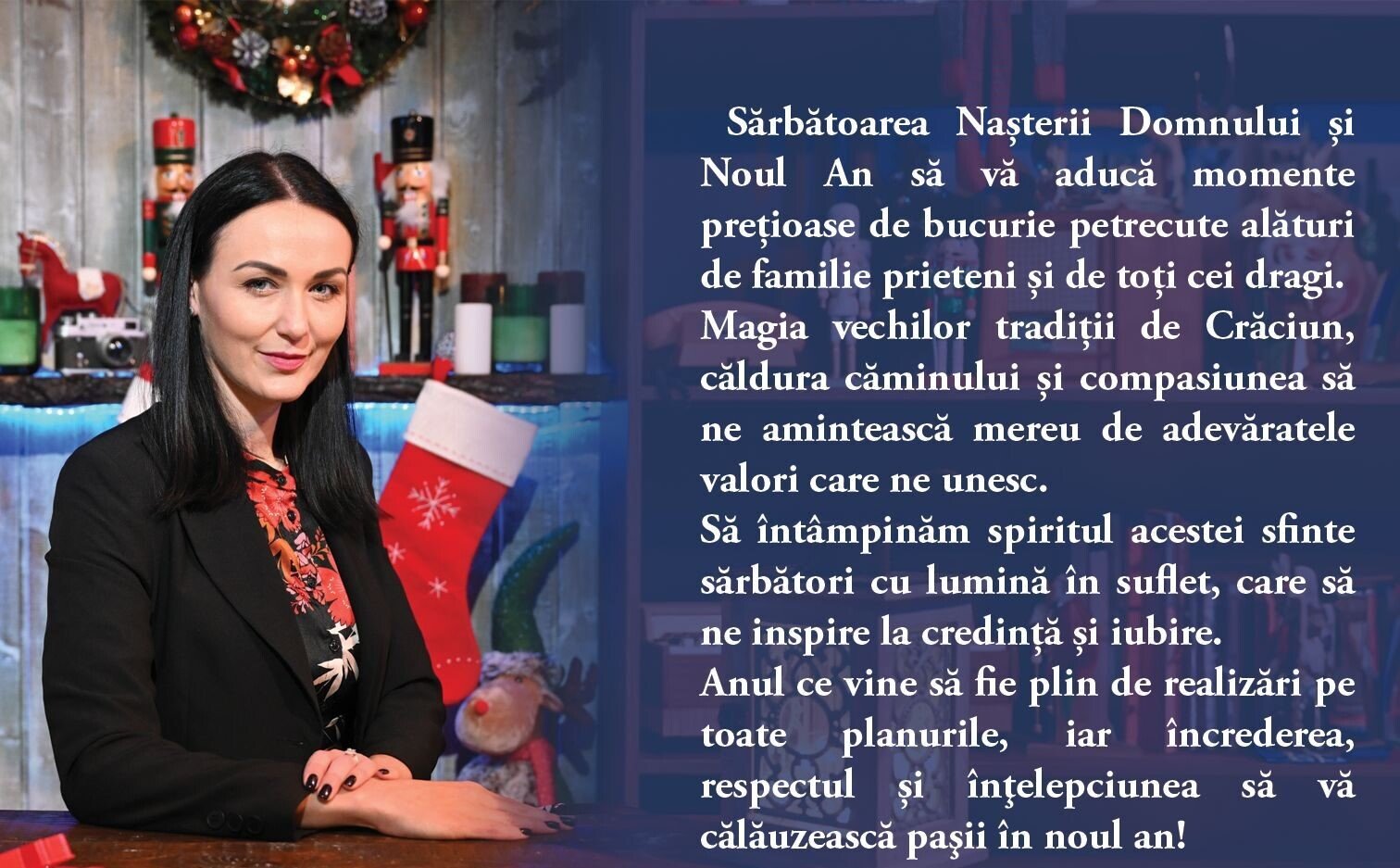 „Sărbătoarea Nașterii Domnului și Noul An să vă aducă omente prețioase de bucurie petrecute alături de toți cei dragi. Magia vechilor tradiții de Crăciun, căldura căminului și compasiunea să ne aminteasă mereu de adevăratele valori care ne unesc. Să întâmpinăm spiritul acestei sfinte sărbători cu lumină în suflet, care să ne inspire la credință și iubire. Anul ce vine să fie plin de realizări pe toate planurile, iar încrederea, respectul și înțelepciunea să vă călăuzească pașii în noul an!