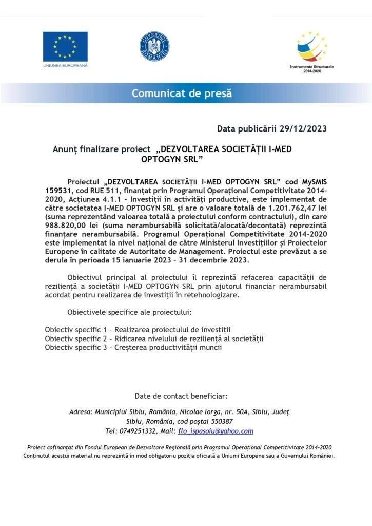 Anunț finalizare proiect „Dezvoltarea Societății I-Med Optogyn SRL”