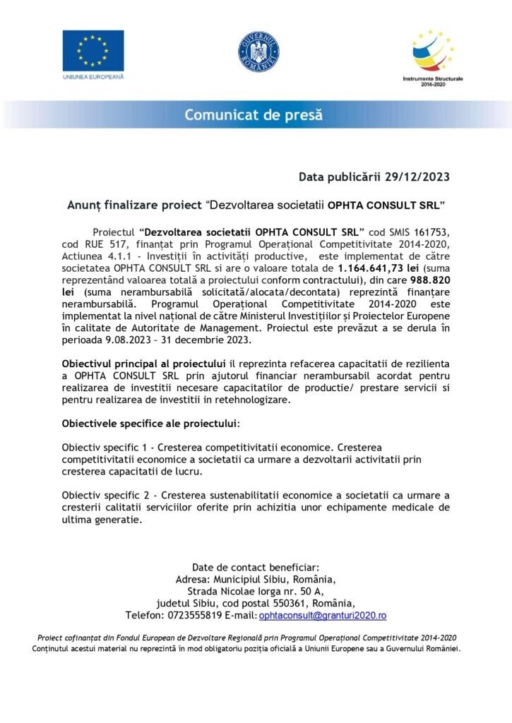 Anunț finalizare proiect „Dezvoltarea societății OPHTA CONSULT SRL”