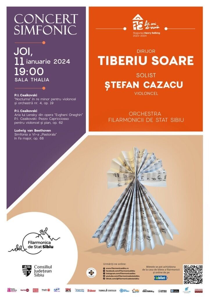 Primul concert simfonic din 2024, cu un program de Ceaikovski și Beethoven, îl readuce pe scena Sălii Thalia pe violoncelistul Ștefan Cazacu, solist concertist al Filarmonicii sibiene. Concertul de joi, 11 ianuarie, va fi condus de dirijorul principal Tiberiu Soare. Biletele sunt disponibile la casierie și pe iabilet.ro la prețul de 60 lei (50% reducere pentru elevi, studenți, pensionari). Înaintea concertului, de la orele 18.00, publicul este așteptat în Chimniță, la „Cafeneaua muzicală” moderată de Mihai Hurezeanu.
