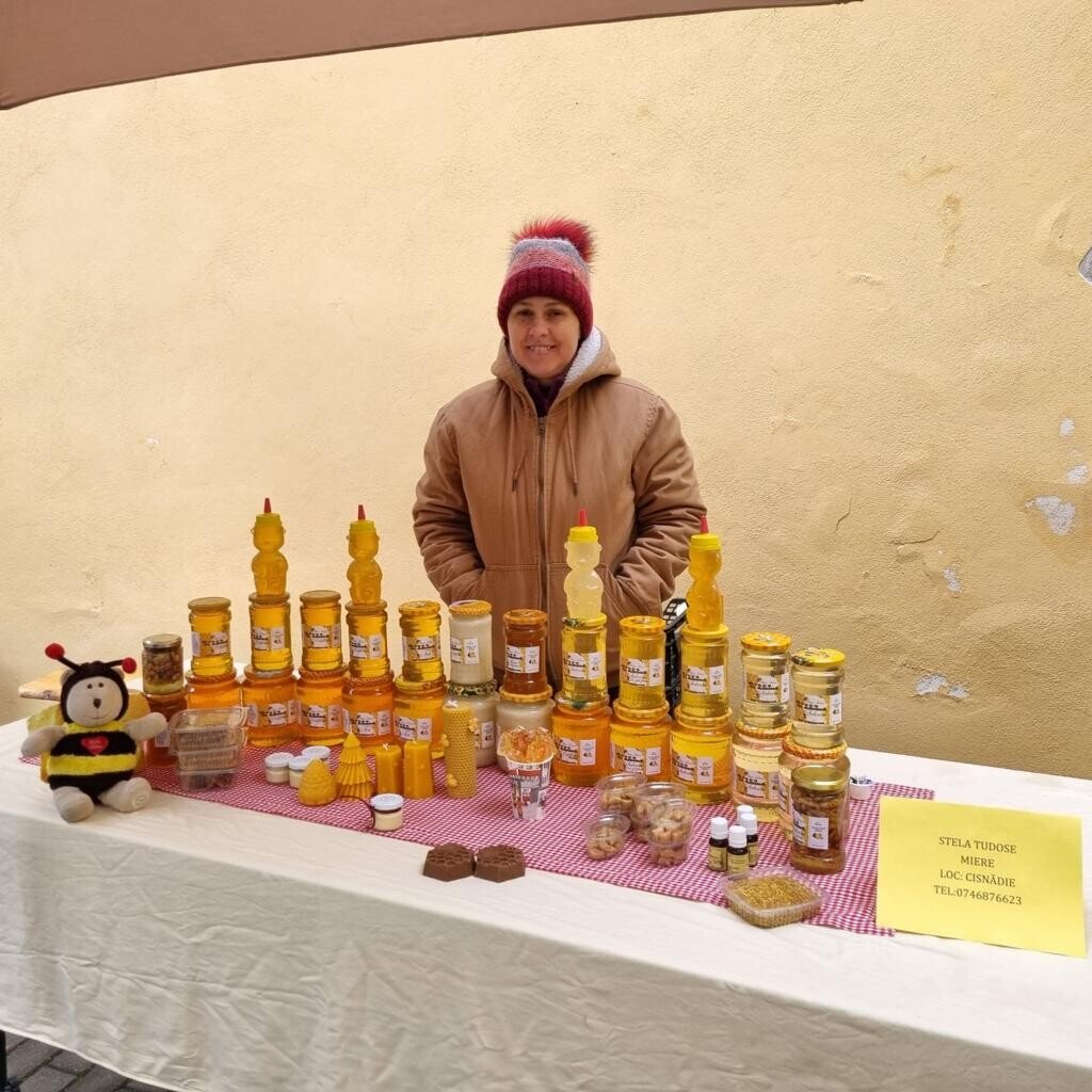 Doamna Stela Tudose din Cisnădie va aduce o gamă diversă de miere și de produse apicole, printre care apreciatele acadele cu miere și propolis sau cu polen.