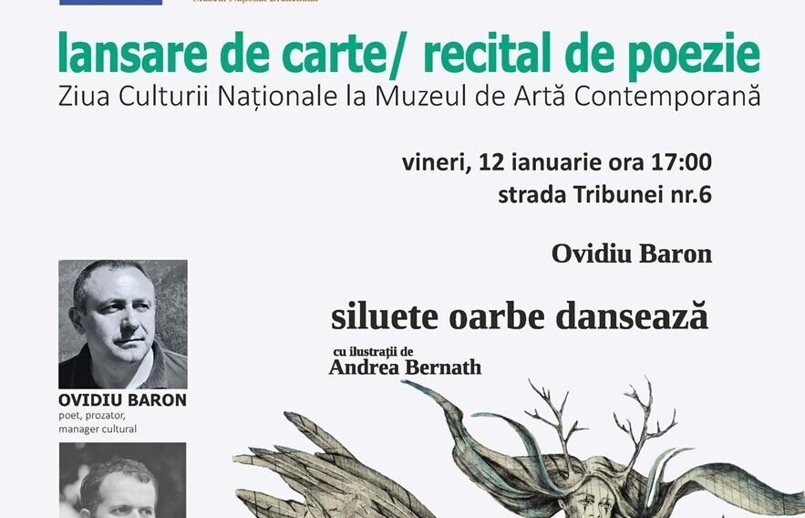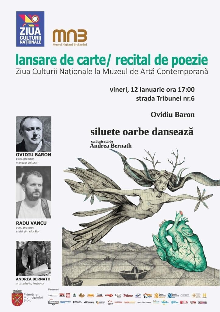 Vineri, 12 ianuarie, începând cu ora 17,00, Muzeul Național Brukenthal vă invită să sărbătorim în avans Ziua Culturii Naționale cu un recital și un dialog despre poezie la Muzeul de Artă Contemporană (strada Tribunei, nr.6), în cadrul expoziției „îmblânzirea iluziilor”. Marcăm cu această ocazie și lansarea volumului „siluete oarbe dansează” semnat de Ovidiu Baron și ale cărui poeme au fost transpuse în viziune grafică de către artista Andrea Bernath.