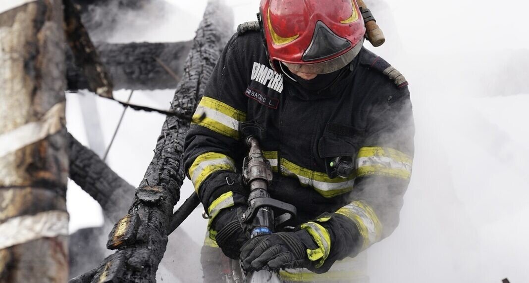 ACTUALIZARE: Incendiul s-a manifestat la coșul de fum, fiind afectat tavanul unei camere pe o suprafață de aproximativ 15 mp în jurul coșului de fum. Restul casei a fost salvată. Cauza incendiului a fost efectul termic produs la coșul de fum deteriorat.