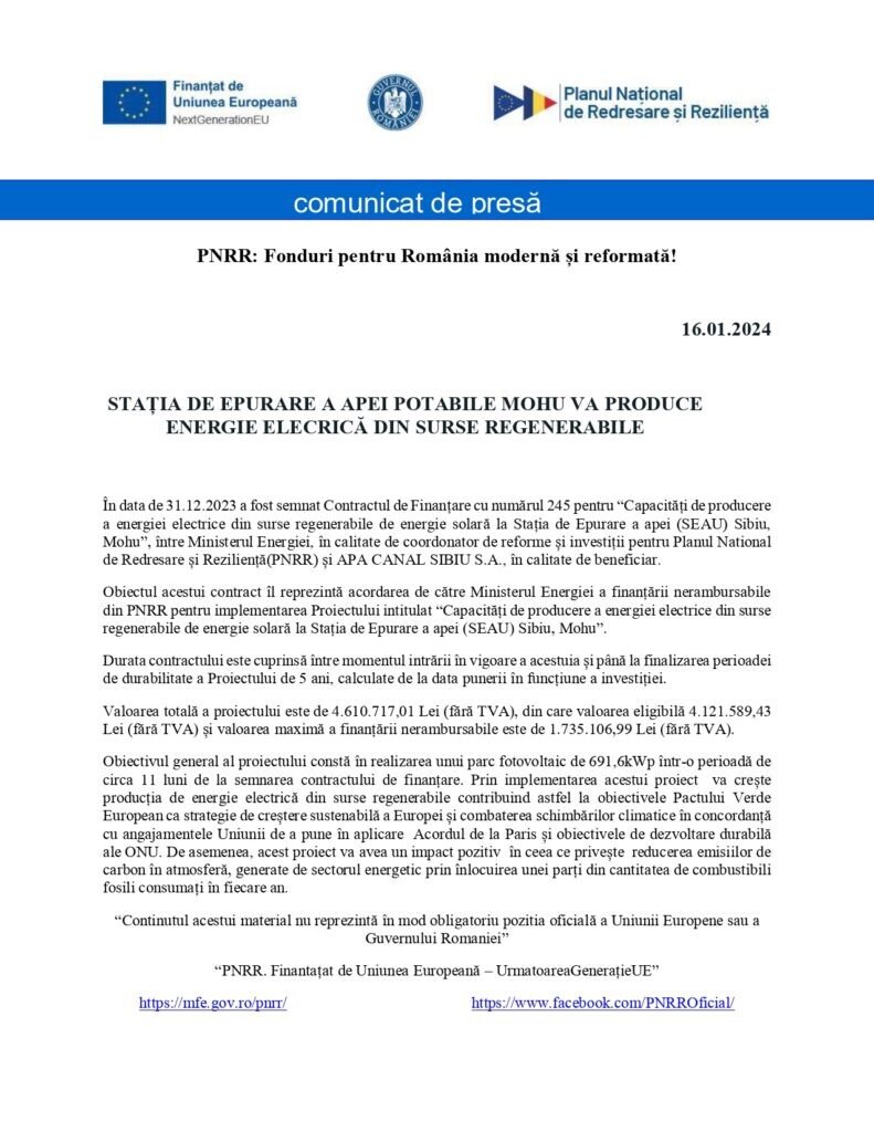 În data de 31.12.2023 a fost semnat Contractul de Finanțare cu numărul 245 pentru “Capacități de producere a energiei electrice din surse regenerabile de energie solară la Stația de Epurare a apei (SEAU) Sibiu, Mohu”, între Ministerul Energiei, în calitate de coordonator de reforme și investiții pentru Planul National de Redresare și Reziliență(PNRR) și APA CANAL SIBIU S.A., în calitate de beneficiar.