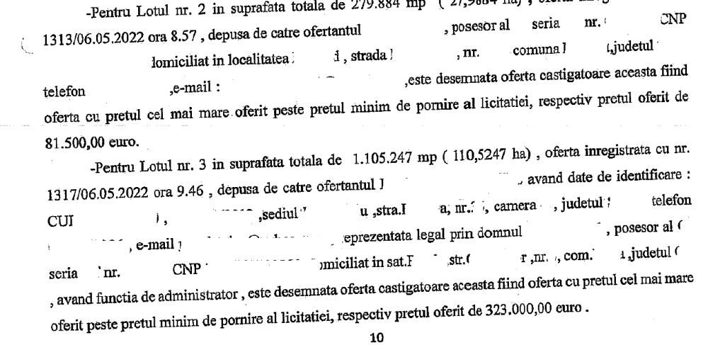 Dar, cum nu știm cine sunt cumpărătorii, putem însă identifica, din cuvintele lăsate în text după cenzură, că este vorba despre 9 persoane fizice și o firmă, care a și pierdut licitația pentru lotul 3, la care a participat. Rezultă toți câștigătorii sunt persoane fizice. Nu știm însă cine, încă. Sumale finale la care s-au adjudecat cele aproape 400 de hectare de teren a fost 1.154.717 euro. Adică un preț de 0,29 euro pe metru pătrat.