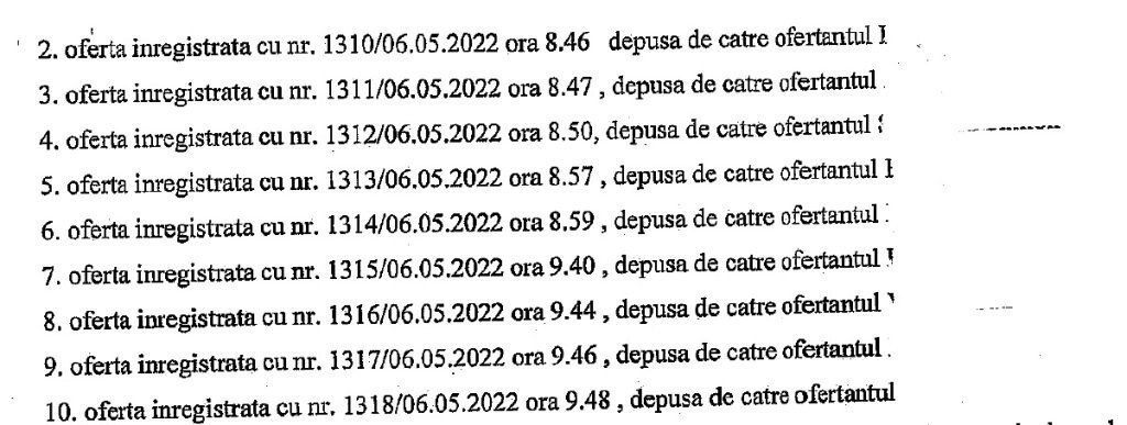 Dar, o privire atentă pe documente ne arată că toate au fost depuse, de toți ofertanții în aceeași, la diferențe de câteva minute. (vezi mai jos foto) Asta înseamnă că toți ofertanții au venit cam deodată să depună ofertele.