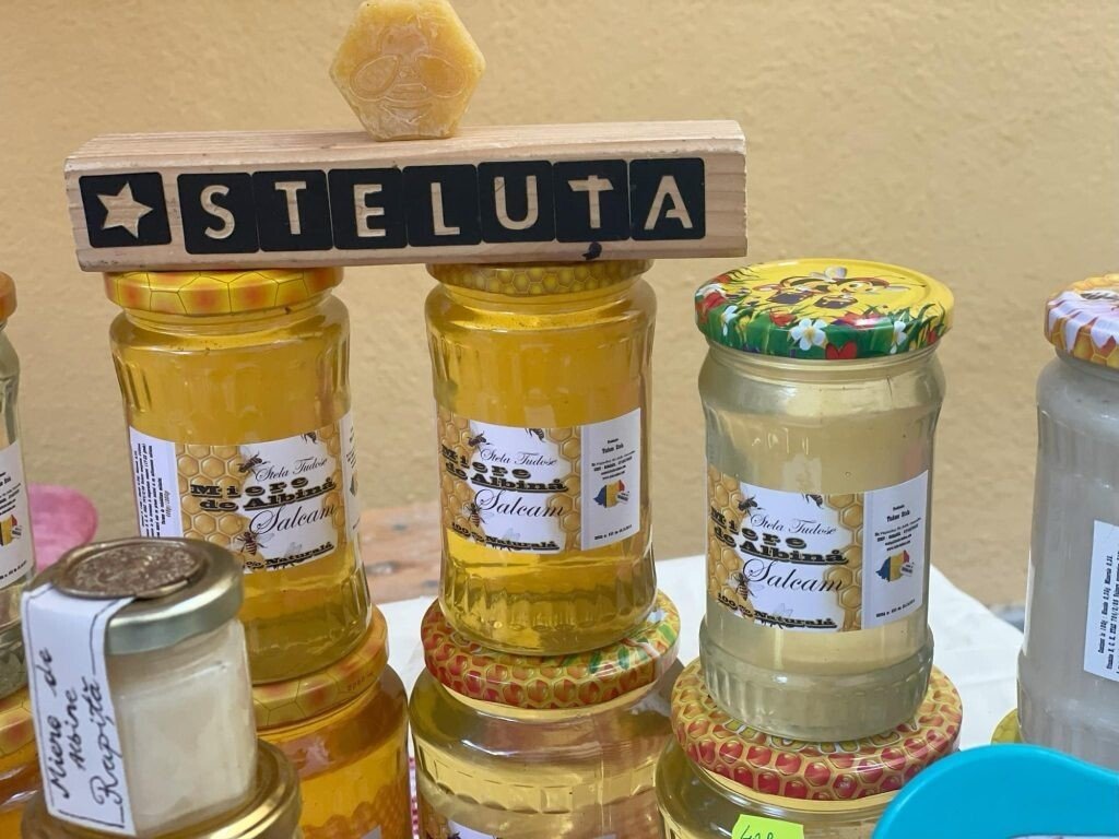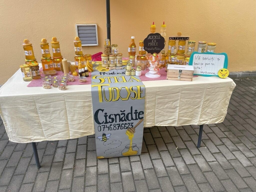 Dovadă de respect și încredere la Piața volantă organizată în curtea Consiliului Județean Sibiu: clienții sunt invitați să-și aleagă singuri borcanul cu miere și să pună banii în cutia alăturată.
