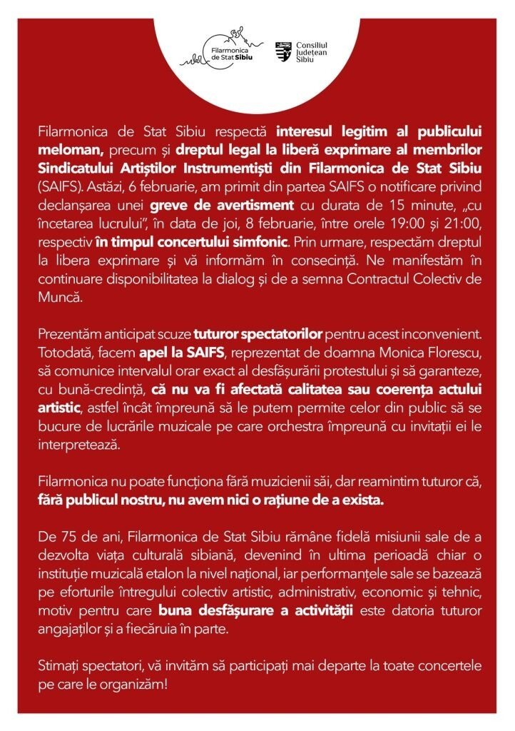 Filarmonica de Stat Sibiu respectă interesul legitim al publicului meloman, precum și dreptul legal la liberă exprimare al membrilor Sindicatului Artiștilor Instrumentiști din Filarmonica de Stat Sibiu (SAIFS).