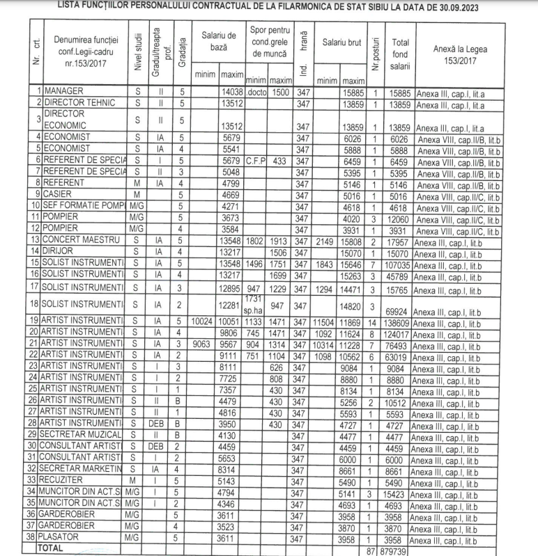 În tot scandalul dintre sindicaliștii instrumentiști de la Filarmonica de Stat Sibiu punctul principal al disputei este semnarea contractului colectiv de muncă. Sindicaliștii s-au plâns că actualul manager Cristian Lupeș îi muncește prea mult și nu respectă orarul de muncă. Cum, la stat, toți angajații au numeroase drepturi și sporuri salariale, am decis să vedem cât sunt în realitate salariile sindicaliștilor. Supriză! Mulți au salarii egale cu ale managerului instituției.