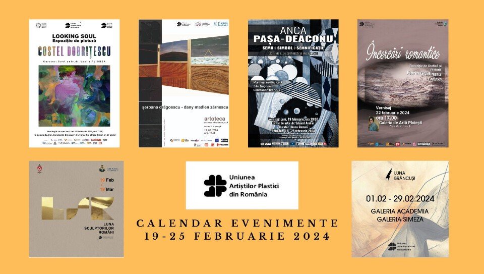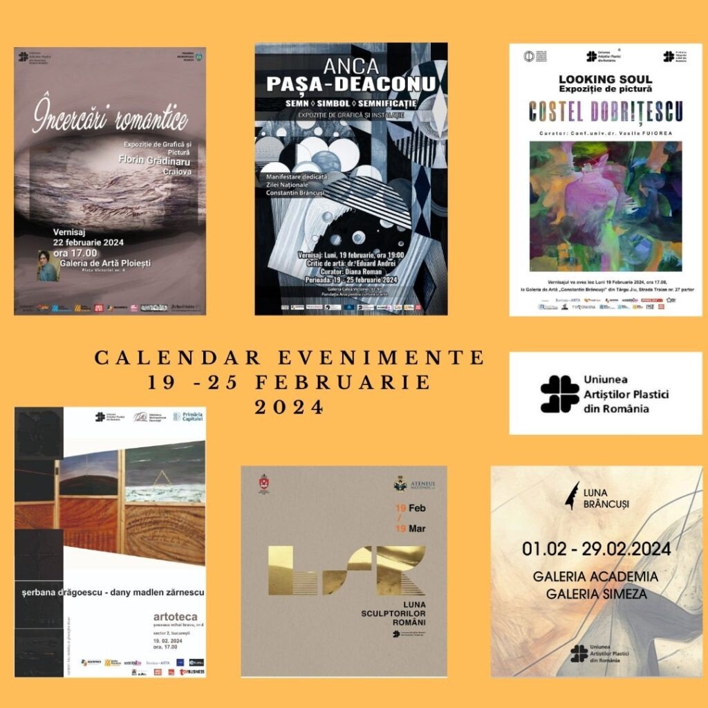 La ora 19:00 se va deschide la Galeria ”Calea Victoriei 91-93” din București, expoziția intitulată „Semn.Simbol.Semnificație.”, semnată de Anca Pașa Deaconu și curatoriată de Diana Roman. Prin proiectul 12, artista Anca Pașa Deaconu și-a propus să organizeze în diverse spații (galerii, muzee) un ciclu de douăsprezece expoziții personale de grafică. Al cincilea eveniment al seriei, organizat sub egida Fundației Ana pentru Cultură și Artă, se alătură evenimentelor dedicate Zilei Naționale ”Constantin Brâncuși”, iar expoziția va putea fi vizitată până pe 25 februarie 2024.