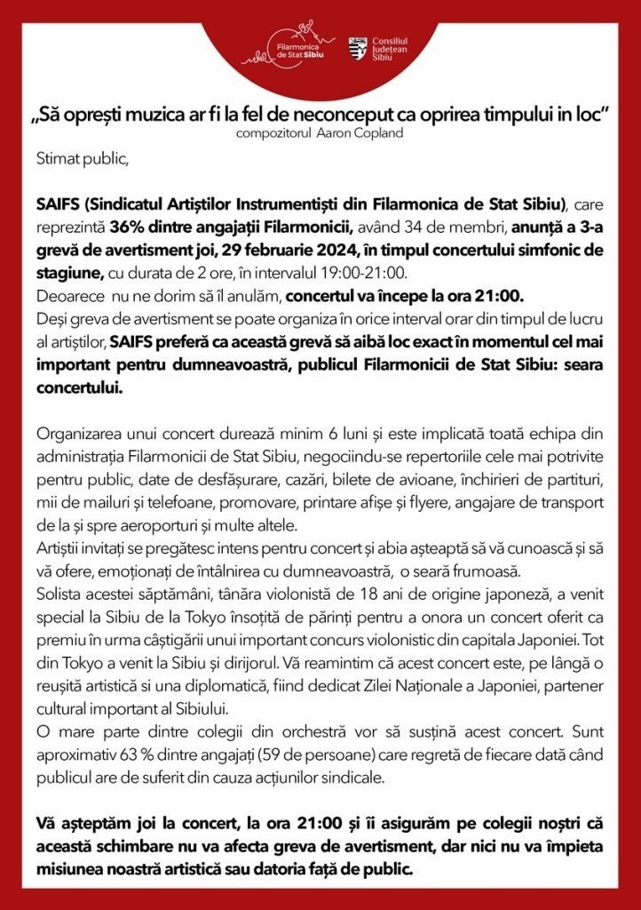 SAIFS (Sindicatul Artiștilor Instrumentiști din Filarmonica de Stat Sibiu), care reprezintă 36% dintre angajații Filarmonicii, având 34 de membri, anunță a 3-a grevă de avertisment joi, 29 februarie 2024, în timpul concertului simfonic de stagiune, cu durata de 2 ore, în intervalul 19:00-21:00.