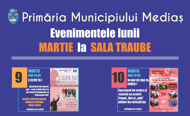 Primăria Municipiului Mediaș, prin Direcția pentru Cultură, organizează în luna martie o serie de evenimente la Sala Traube. Seria spectacolelor debutează în zilele de 9 și 10 martie, cu două spectacole dedicate doamnelor și domnișoarelor, intrarea fiind liberă, în limita locurilor disponibile.