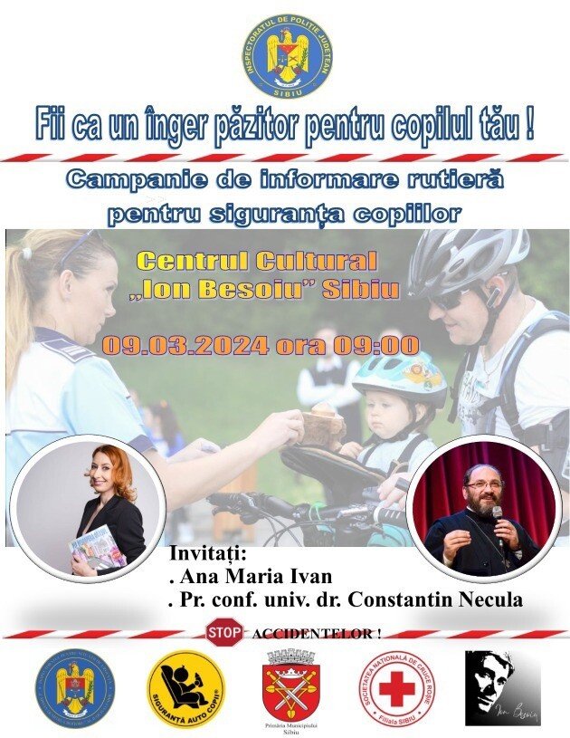 Conform polițiștilor sibieni, copiii sunt printre cei mai vulnerabili utilizatori ai drumului, întrucât de siguranța lor depinde atitudinea noastră. Siguranța copiilor pe drumurile publice este responsabilitatea adulților care conduc autovehiculul în care cei mici sunt transportați. La eveniment vor participa: părintele preot conf. univ. dr. Constantin Necula, doamna Ana Maria Ivan, autor de cărți pentru copii și cunoscutul blogger pe teme de parenting, alături de reprezentanți ISU Sibiu – SMURD și Crucea Roșie – Filiala Sibiu
