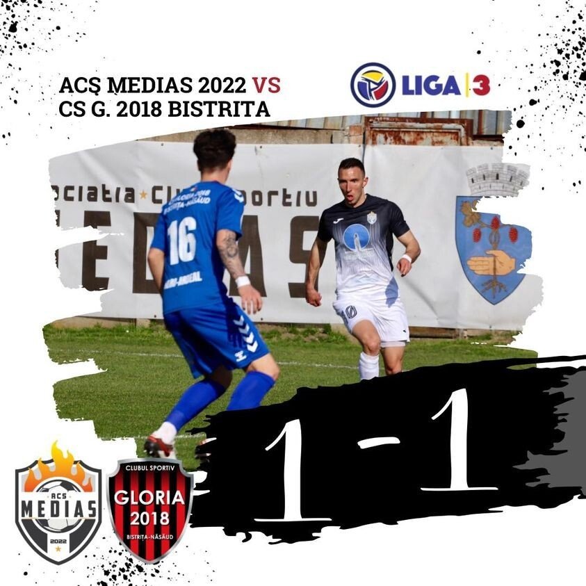 Partida ACS Mediaș – CS Gloria 2018 Bistrița Năsăud s-a încheiat la egalitate, scor 1-1. Pentru gazde a marcat la mijlocul primei reprize atacantul echipei, Magyari Szilard. Oaspeții au reușit să egaleze în minutul 42 după un gol marcat dintr-un penalty contestat îndelung de jucătorii medieșeni.