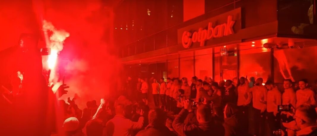În jur de 100 de suporteri dinamoviști și-au așteptat favoriții în fața Hotelului Ramada din Sibiu. Vineri seara, suporterii au cântat alături de jucători, conducători și nu au ezitat să aprindă torțe, chiar dacă autoritățile au declarat război fanilor care folosesc materiale pirotehnice.